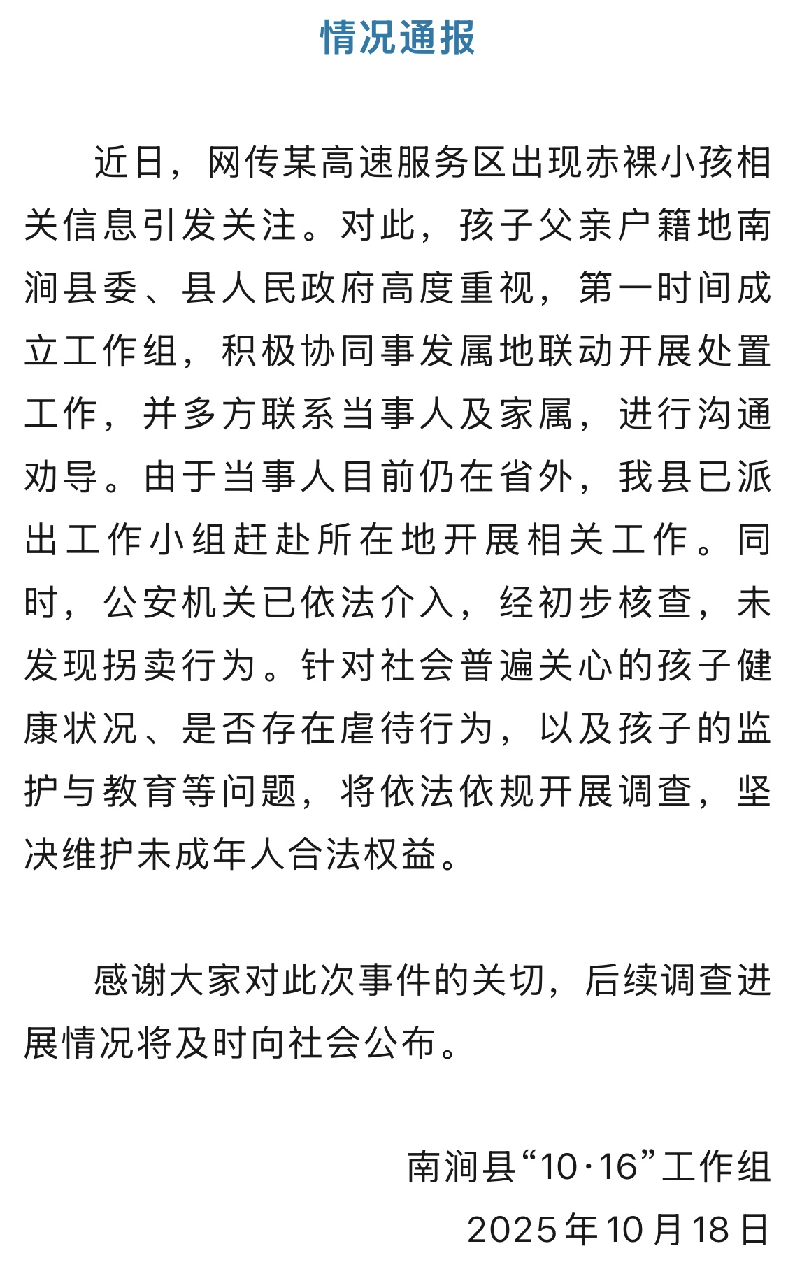 近日,网传某高速服务区出现赤裸小孩相关信息引发关注。对此,孩子父亲户籍地南涧县委、县人民政府高度重视,第一时间成立工作组,积极协同事发属地联动开展处置工作海通众合,并多方联系当事人及家属,进行沟通劝导。由于当事人目前仍在省外,我县已派出工作小组赶赴所在地开展相关工作。同时,公安机关已依法介入,经初步核查,未发现拐卖行为。针对社会普遍关心的孩子健康状况、是否存在虐待行为,以及孩子的监护与教育等问题,将依法依规开展调查,坚决维护未成年人合法权益。