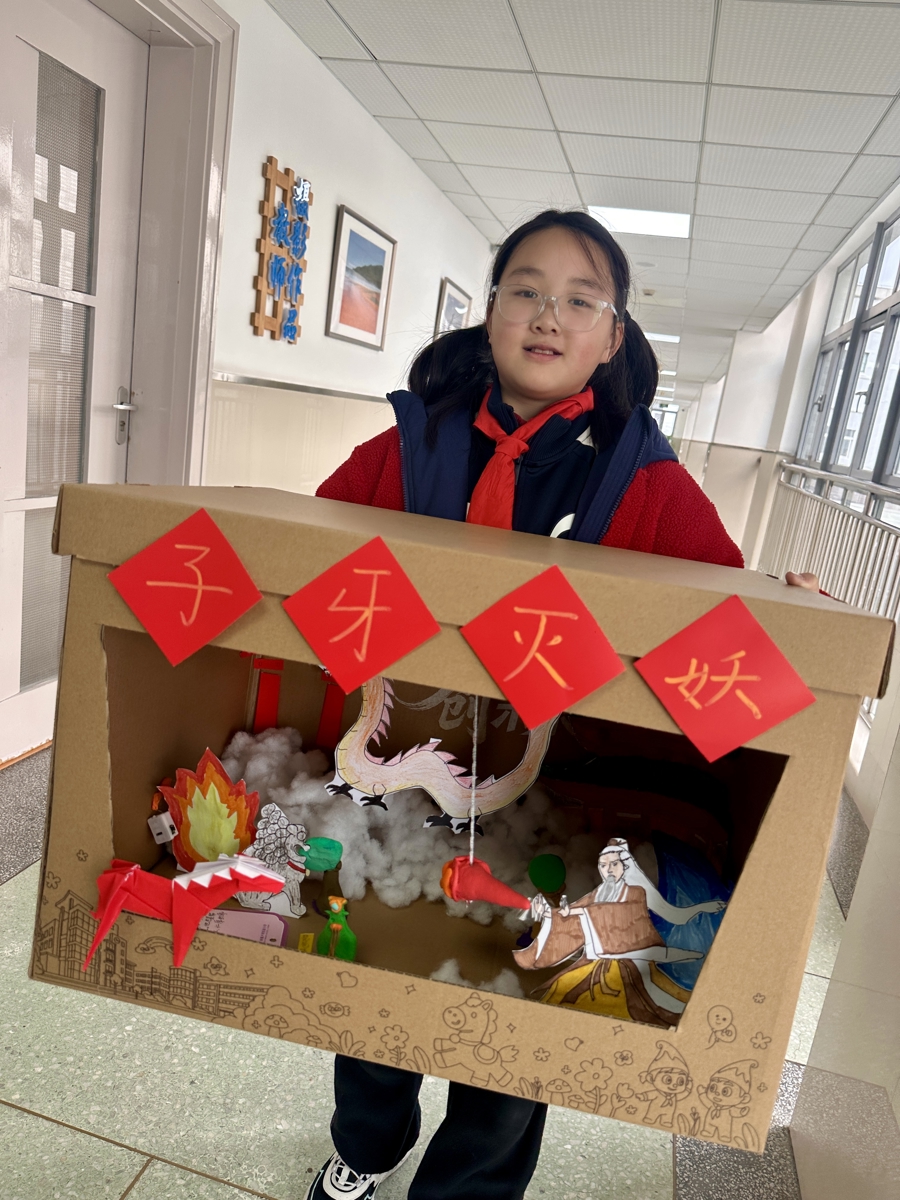 四(4)班女孩施玥宸所在小队选择的书目是《封神演义》,姜子牙智斗妖精的故事让大家着迷。“我们想把这个神话场景从书本里‘搬’出来,做成一件看得见、摸得着的手工作品。”施玥宸介绍,大家先借助AI生成构思图,然后分工合作——用卡纸绘制出姜子牙、神龙和宫殿;用超轻彩泥捏出挣扎的琵琶精、跳动的火焰和翠绿的树木。为了制作“重峦叠嶂”的背景,有同学贡献出了自己的旧娃娃,掏出一朵朵棉花,再在家里搜罗出灯珠,埋进“山崖”。灯光忽明忽暗,神话故事的氛围感升起。