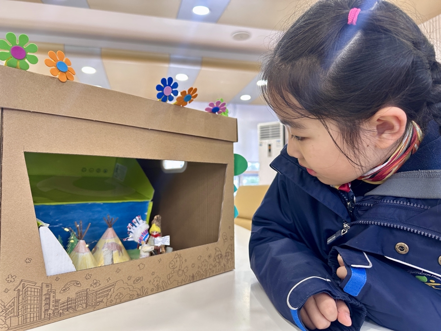 读了《丁丁历险记》系列中的《丁丁在美洲》,一年级妹妹成罄宜特别喜欢封面图片。但是复刻这张图对她来说有点难,于是请妈妈一起来帮忙。母女俩捡来树枝,支起了印第安帐篷和立柱,找来玩具“摩比小人”,翻箱倒柜找来洗脸巾、医用棉花等,给它们制作衣服和发饰,让它们扮演丁丁和印第安长老。虽然妈妈的画功比女儿精细很多,但小姑娘贡献了点睛之笔,因为她把故事读得很仔细。“故事里面,丁丁被绑在柱子上,应该是惊慌的表情,但是小人的表情是在微笑。所以呢,我就用双面胶剪了一个很小的圆片,贴上去,看,像不像他惊慌得张大了嘴巴!”指着米粒大小的嘴巴,成罄宜自豪地介绍。她还告诉记者一个秘密,“丁丁现在的头发用的是棉花,第一版的头发是用绒线粘上去的,“哈哈,我发现这不像丁丁,却像……特朗普!”