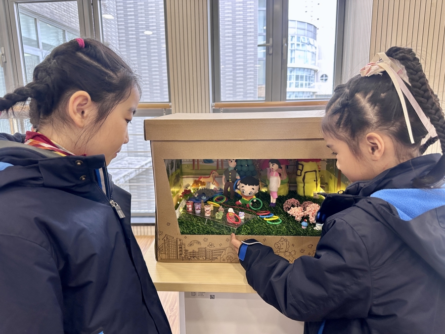 二(7)班曾允桐小组搭建的作品是《大头儿子和小头爸爸》,挑选了书中《毛叔的“圈套”》这个故事来设计场景,因为套圈这个游戏很多同学都玩过,而且故事中“小头爸爸”陪着“大头儿子”一次次练习套圈,满满的爱和有趣的互动,特别动人。曾允桐捏的“围裙妈妈”太高,重心不稳老是倒,爸爸想出了妙招,顺手把附赠的彩泥工具嵌入“围裙妈妈”的身体,搞定!“就像‘小头爸爸’不放弃帮‘大头儿子’套圈一样,我们设计时遇到小问题也一起想办法解决。”曾允桐说,就像故事里的一家三口一样,在制作“故事纸箱”的过程中,她也享受着和爸爸妈妈一起分享故事、一起玩耍的快乐。