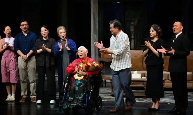 收官演出当晚,剧本翻译者、98岁的美籍华裔前辈艺术家卢燕在濮存昕的介绍下登台谢幕,一袭红衣,画着精致的妆容,依然中气十足。当濮存昕告诉观众,再过几天就是卢燕老师99岁的生日时,全场高喊“生日快乐”!卢燕也表示,这是自己最愉快最兴奋的一个生日。