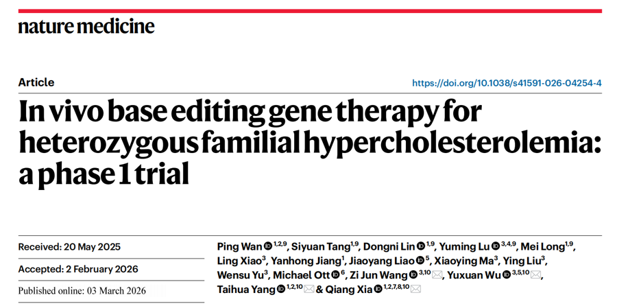 今日,上海交通大学医学院附属仁济医院发表重磅科研成果,中国工程院院士、仁济医院院长夏强领衔的团队,在国际顶尖学术期刊《自然・医学》(Nature Medicine,IF=50.0)发表全球首个运用肝脏靶向体内碱基编辑技术治疗杂合子家族性高胆固醇血症的Ⅰ期临床试验结果。这一研究首次在人体中证实了该基因治疗手段的安全性和有效性,为这一遗传代谢性肝病患者摆脱终身用药负担带来全新希望。